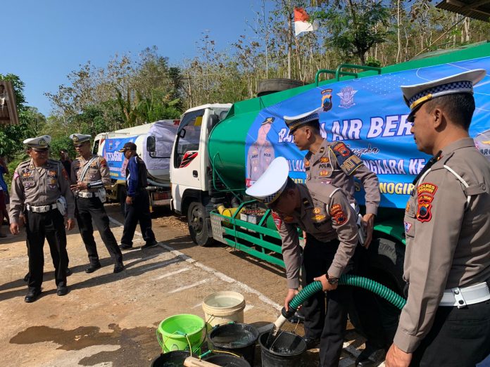 Dipimpin Kasat Lantas AKP Subroto, S.H., M.H., Sat Lantas Polres Wonogiri mendistribusikan 11 Tangki air bersih untuk masyarakat Desa Ketos Kecamatan Paranggupito Kab. Wonogiri. Sabtu (7/9/2024)