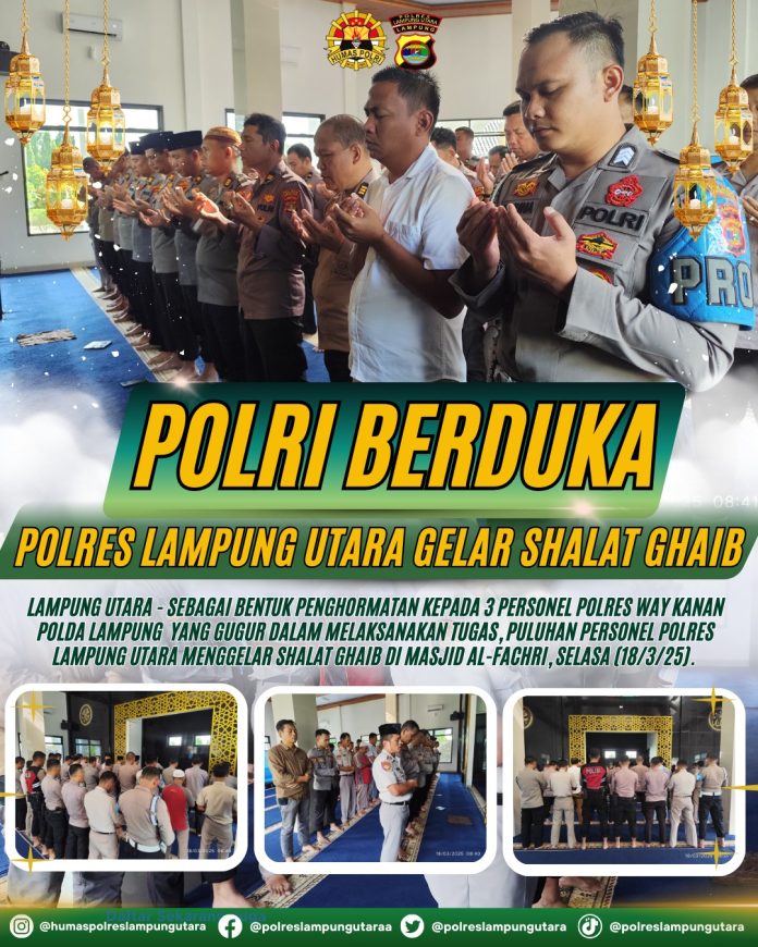 Suaralintas.com II Biro Lampung Utara, – Sebagai bentuk penghormatan kepada 3 personel Polres Way Kanan Polda Lampung yang gugur dalam melaksanakan tugas, puluhan personel Polres Lampung Utara menggelar Shalat Ghaib di Masjid Al-Fachri, Selasa (18/3/25).