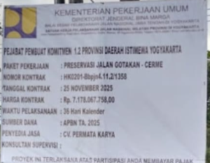 Kulonprogo suara lintas com. Proyek preservasi Jalan Gotaaan-Cermai kulonprogo telah selesai dikerjakan sesuai kontrak, dengan total biaya sebesar Rp7.178.067.758,00 yang bersumber dari Dana APBN 2025. Ardi, petugas lapangan, menyatakan bahwa proyek ini dikerjakan sesuai spesifikasi teknis dan jadwal yang ditentukan, sehingga penyelesaian tepat waktu.