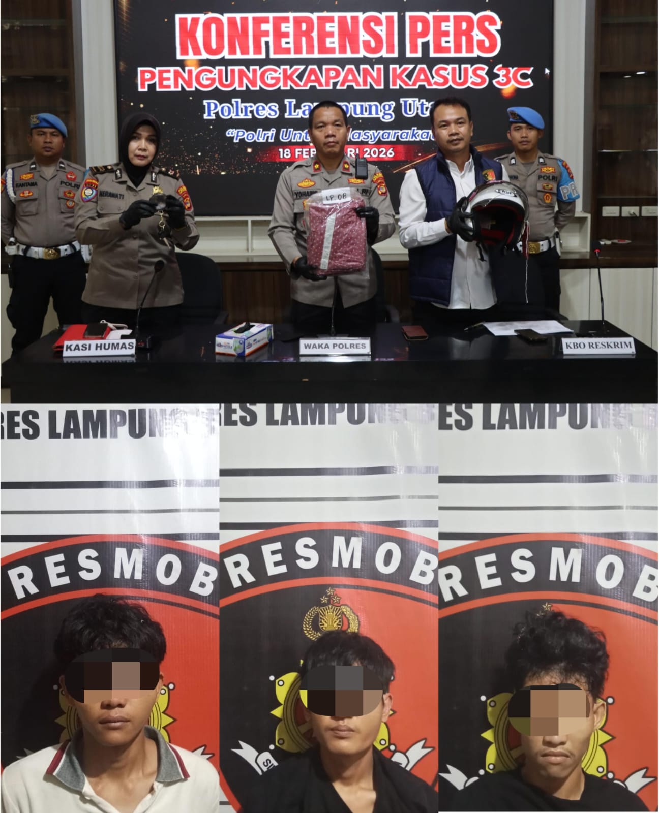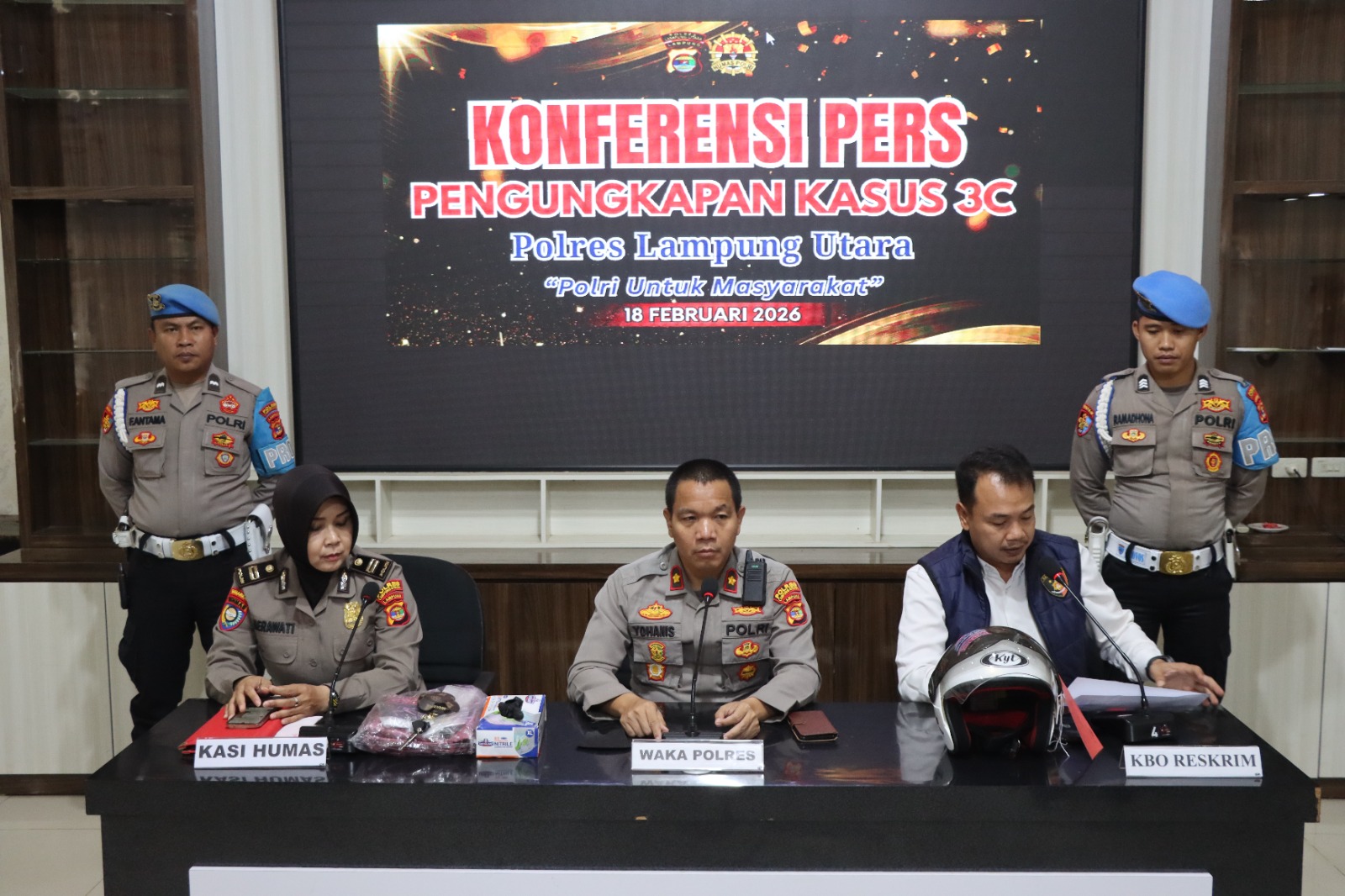 “Setelah menerima laporan, petugas langsung mendatangi tempat kejadian perkara (TKP), melakukan olah TKP, serta mengumpulkan keterangan saksi dan barang bukti, jelas Wakapolres Kompol Yohanis, didampingi Plt Kasi Humas Iptu Herawati dan KBO Sat Reskrim Ipda Wiby saat Konferensi Pers, Rabu (18/2/26).