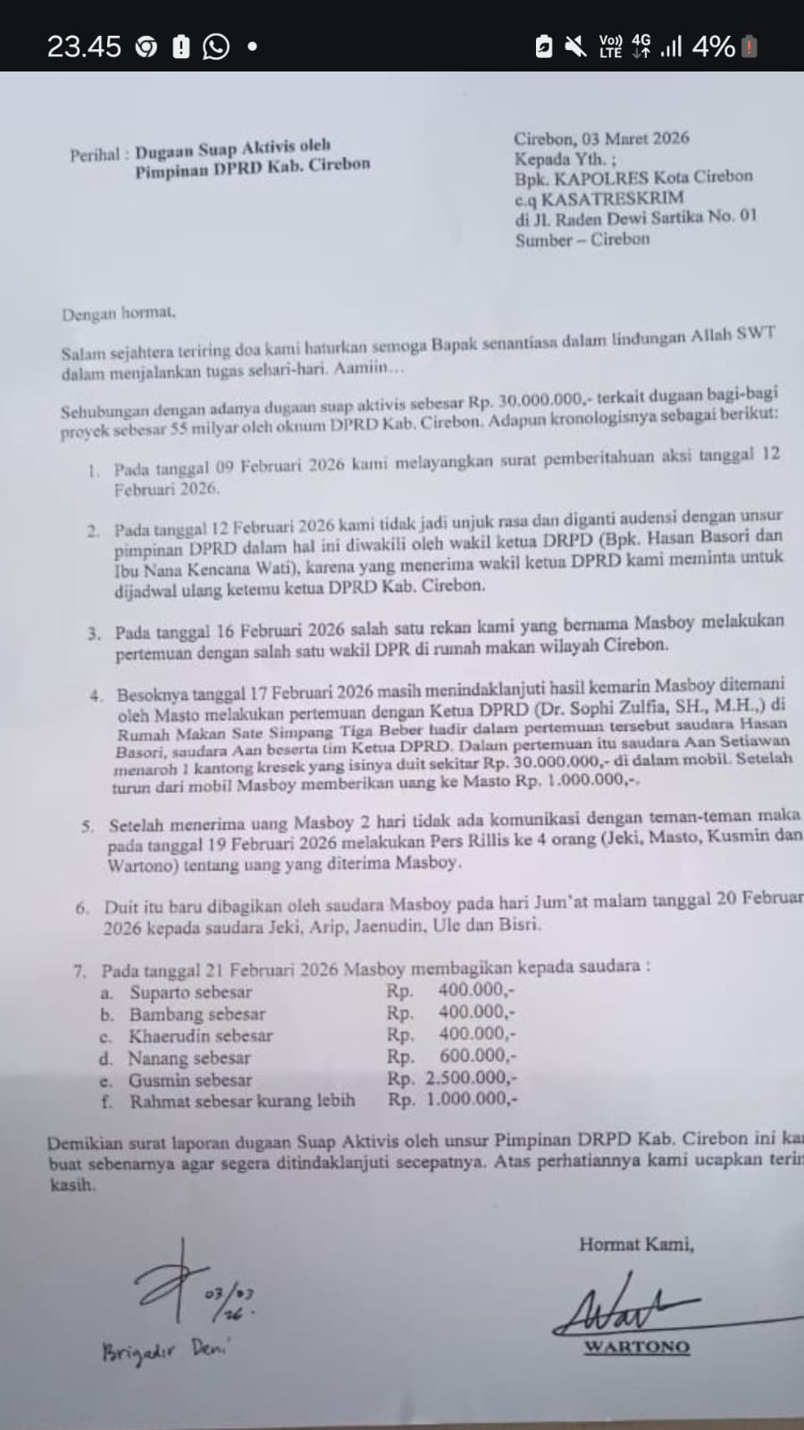 – Organisasi Persatuan Wartawan Fast Respon ( PW- FRN) Counter Polri Cirebon Raya menyoroti laporan dugaan suap terhadap sejumlah aktivis yang diduga melibatkan oknum anggota **DPRD Kabupaten Cirebon. Laporan tersebut telah disampaikan kepada aparat kepolisian dan kini menjadi perhatian publik.