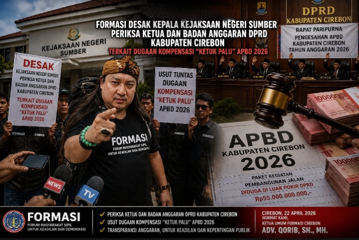 — Organisasi masyarakat Forum Masyarakat Sipil untuk Keadilan dan Demokrasi (FORMASI) Cirebon mendesak Kejaksaan Negeri Sumber untuk tidak bersikap pasif serta segera melakukan langkah penyelidikan atas dugaan adanya praktik kompensasi dalam proses pengesahan Anggaran Pendapatan dan Belanja Daerah (APBD) Kabupaten Cirebon Tahun Anggaran 2026.